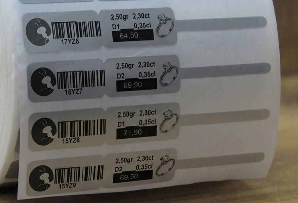 Kuyumcu etiketleri; altın, pırlanta, gümüş ve diğer değerli mücevher ürünlerinin güvenli, düzenli ve profesyonel şekilde etiketlenmesi için özel olarak üretilmektedir. Küçük ölçüde maksimum bilgi aktarımı sağlayan yapısıyla fiyat, gramaj, ürün kodu ve barkod bilgilerinin net ve okunabilir şekilde sunulmasına imkân tanır.